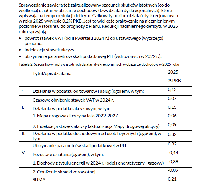 Drugim filarem strategii konsolidacyjnej są działania dyskrecjonalne – zmiany w prawie, które zwiększają dochody budżetowe. Ministerstwo Finansów i Gospodarki wskazało w odpowiedziach na wnioski o informację publiczną, że całkowity poziom działań dyskrecjonalnych w 2025 roku wyniesie 0,2 proc. PKB.